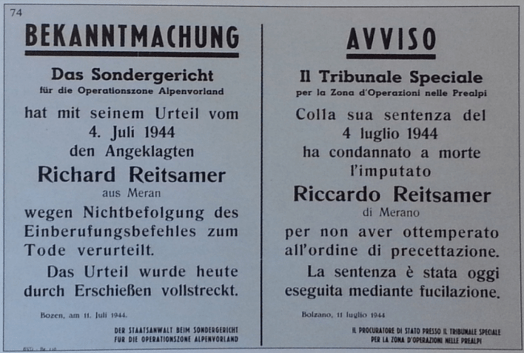 Nel 1939, di fronte all’Opzione, Reitsamer decise di scegliere la cittadinanza italiana. Ciononostante nel 1944, dopo l’occupazione nazista, ricevette la cartolina precetto per l’esercito del Reich. Fu la sua mancata riposta a questa chiamata a condurlo al patibolo nel giro di pochi mesi. Don Giovanni Nicolli, allora cappellano del carcere di Bolzano, raccontò così le ultime ore di Richard. “Sapevo – scrisse nel suo diario – che Reitsamer era in carcere da qualche mese, quale renitente alla leva, ma non avevo mai giudicato il suo caso grave. Un giorno però al Tribunale Speciale vengo a sapere che se il Reitsamer non avesse cambiato idea, le cose sarebbero andate assai male per lui. Lo avvicinai per sapere chiara la sua situazione. Egli mi dice: ‘Ho ricevuto la cartolina precetto per presentarmi alla leva militare, ma io non ci sono andato, nemmeno al seconda volta e neppure la terza quando i gendarmi mi hanno portato di viva forza. Ho protestato e non mi sono lasciato visitare, dicendo come il Papa che con la pace c’è tutto da guadagnare e con la guerra tutto da perdere. Io non voglio quindi in nessun modo presentarmi alla guerra e neppure al servizio militare…’”.