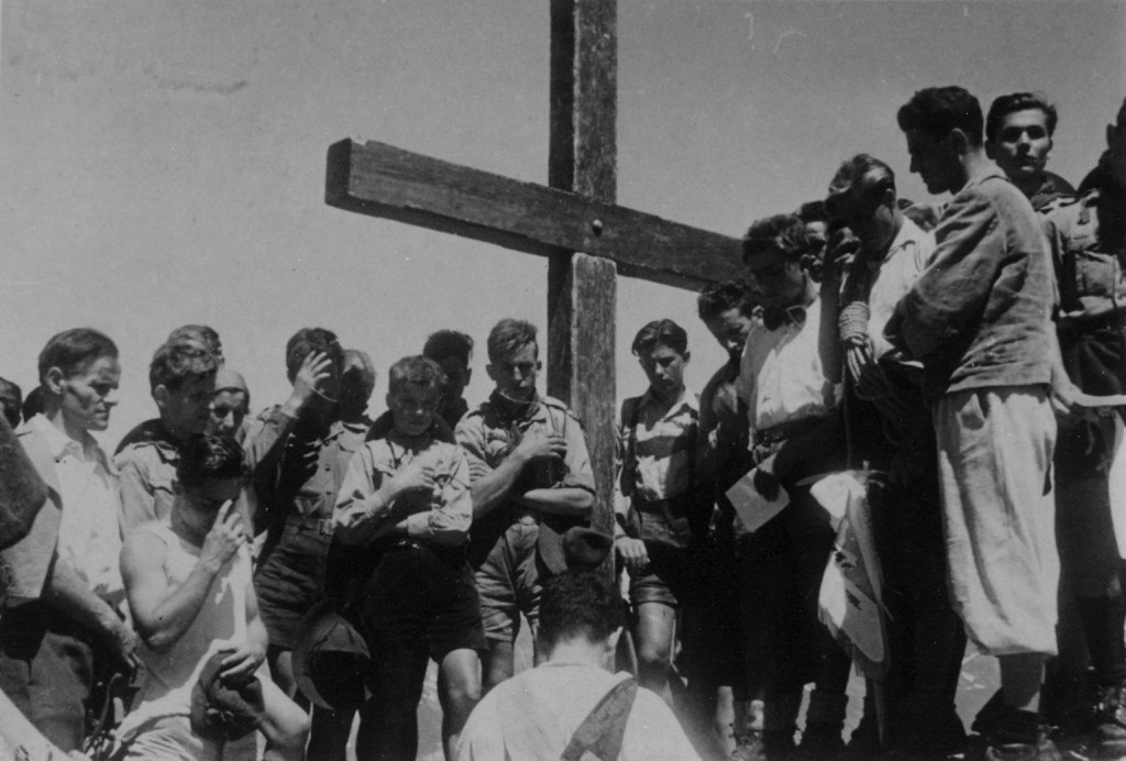 La foto risale al 16 luglio del 1950. Raffigura l’inaugurazione della croce di legno sulla cima del Cigat, a tremila metri di quota, nel gruppo del Tessa. “Fu la prima croce in montagna del circondario di Merano”, ricorda con orgoglio Giuseppe Anzelini. “Quel giorno nacque la Società alpinistica Adamello, di cui don Giovanni Costanzi fu il primo assistente. Nella foto è al centro, di spalle, sta benedicendo la croce”.