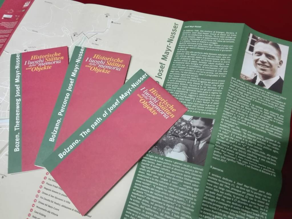 L’idea di proporre del percorso tematico nasce in seno al gruppo di lavoro diocesano per la beatificazione di Josef Mayr-Nusser. Il pieghevole è stato realizzato dal Centro per la Pace in collaborazione con Comune (Archivio storico) e Azienda di soggiorno di Bolzano, Ufficio pastorale e Caritas diocesana.