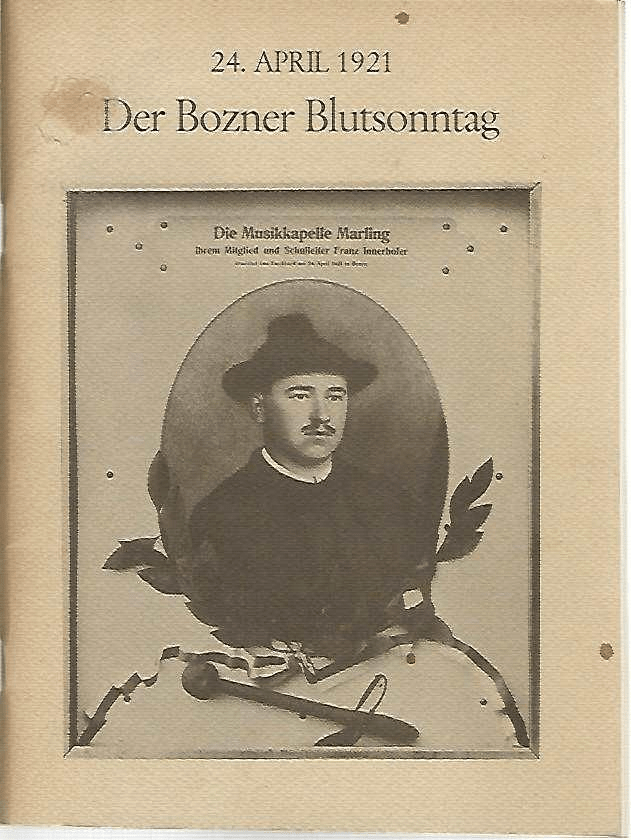 La sintesi più efficace di quanto accadde in quei giorni d’aprile 1921 è quella riportata dalla targa fatta apporre dal Comune in centro città. Dice così: “Franz Innerhofer è la prima vittima del fascismo in Provincia di Bolzano. Il trentaseienne maestro elementare nonché dirigente della banda musicale di Marlengo fu ucciso a colpi di pistola da uno squadrista fascista il 24 aprile 1921, la cosiddetta ‘Domenica di sangue’, quando la tradizionale sfilata della Fiera di Bolzano fu violentemente attaccata e mentre Innerhofer aveva cercato di proteggere uno scolaro nel portone del palazzo Stillendorf”.