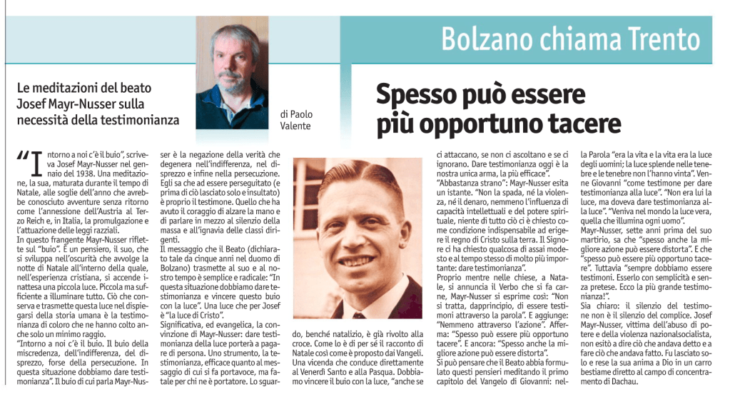 Mayr-Nusser, sette anni prima del suo martirio, sa che “spesso anche la migliore azione può essere distorta”. E che “spesso può essere più opportuno tacere”. Tuttavia “sempre dobbiamo essere testimoni. Esserlo con semplicità e senza pretese. Ecco la più grande testimonianza!”.
