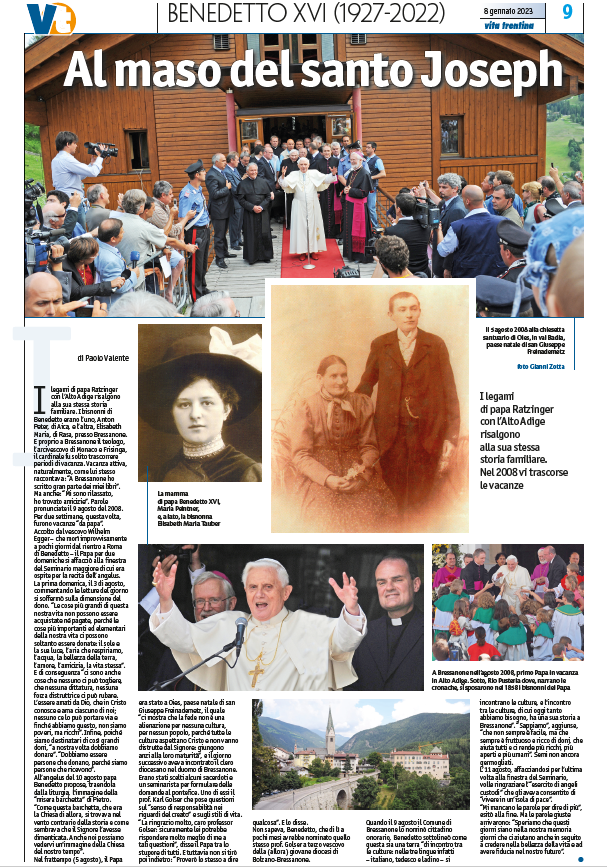 I legami di papa Ratzinger con l’Alto Adige risalgono alla sua stessa storia familiare. I bisnonni di Benedetto erano l’uno, Anton Peter, di Aica, e l’altra, Elisabeth Maria, di Rasa, presso Bressanone. E proprio a Bressanone il teologo, l’arcivescovo di Monaco e Frisinga, il cardinale fu solito trascorrere periodi di vacanza. Vacanza attiva, naturalmente, come lui stesso raccontava: “A Bressanone ho scritto gran parte dei miei libri”. Ma anche: “Mi sono rilassato, ho trovato amicizie”. Parole pronunciate il 9 agosto del 2008. Per due settimane, questa volta, furono vacanze “da papa”.