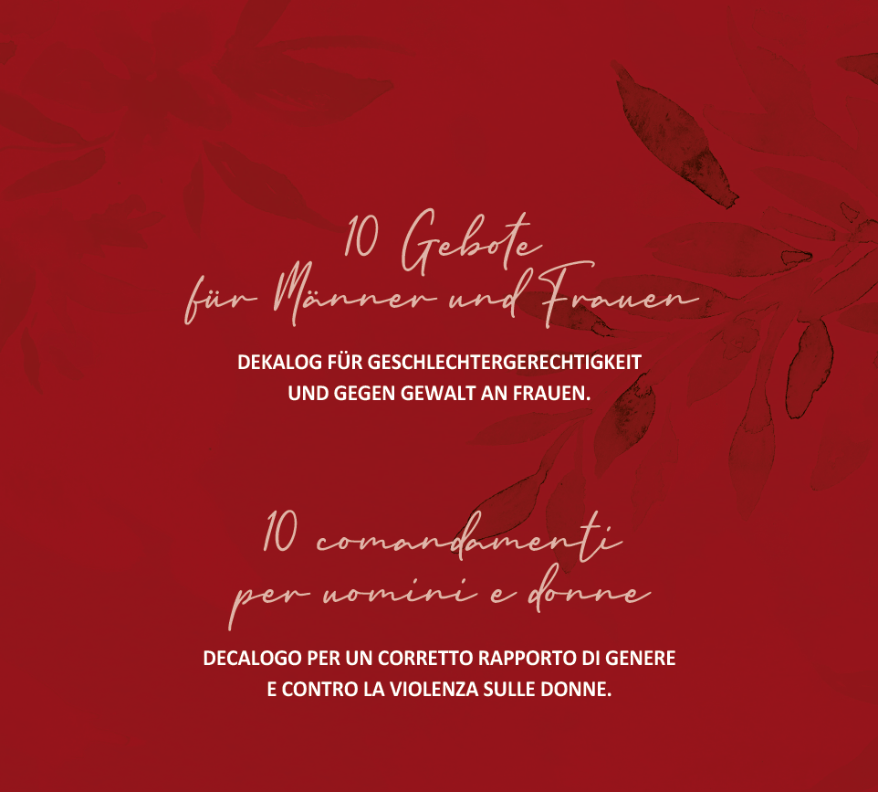 “Ciascuno e ciascuna di noi ha la possibilità di attivarsi per sostenere quelle persone che nella chiesa nella politica e nella società si impegnano con coraggio affinché le donne siano meglio tutelate e si superino situazioni di violenza sia individuali che strutturali. Che sempre più persone nella nostra terra siano aperte e impegnate, lo mostra tutta una serie di progetti che scaturiscono dalla base”, scrivono Johann Kiem, Hannes Rechenmacher e Christine Vieider, nell’illustrare il primo dei dieci comandamenti: “Sostengo la Chiesa, la politica e la società nel decidere misure che abilitino le donne a liberarsi da situazioni (strutturali) di violenza”.