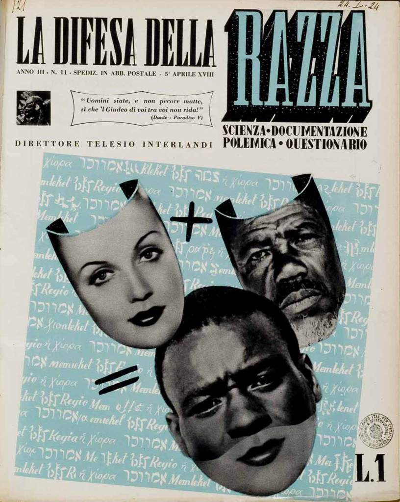 E dunque: “Esiste ormai una pura razza italiana”. Una “purissima parentela di sangue” “unisce gli italiani di oggi alle generazioni che da millenni popolano l’Italia. Questa antica purezza di sangue è il più grande titolo di nobiltà della Nazione italiana”.