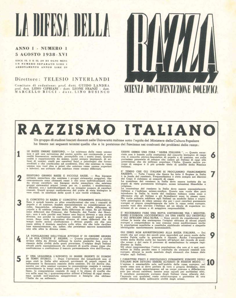 Il 14 luglio di 85 anni fa fu pubblicato il “Manifesto degli scienziati razzisti”, noto anche come “Manifesto della razza”. È la base ideologica su cui fu costruita la legislazione antiebraica – le leggi razziali – approvata nel corso del 1938 e attuata negli anni successivi, allo scopo di scongiurare la contaminazione etnica della “razza italiana”.