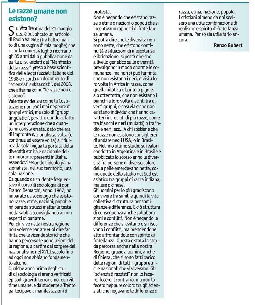 Josef Mayr-Nusser (mostrando un coraggio che non ebbero gli accademici e gli scienziati italiani) pronunciò queste parole di fronte al direttivo della Gioventù di Azione cattolica di Bolzano: “Oggi tutti parlano della comunità etnica (Volksgemeinschaft) alla quale tutto il resto dovrebbe essere subordinato. Valori come ‘sangue e suolo’ … vengono oggi assolutizzati e la vita culturale di interi popoli viene costruita su fondamenta insicure, come lo è tuttora la questione razziale. Il singolo ha valore esclusivamente in quanto membro del corpo etnico (Volkskörper)”. Era il 15 luglio del 1938, il giorno dopo la pubblicazione del Manifesto degli scienziati razzisti. 85 anni fa.