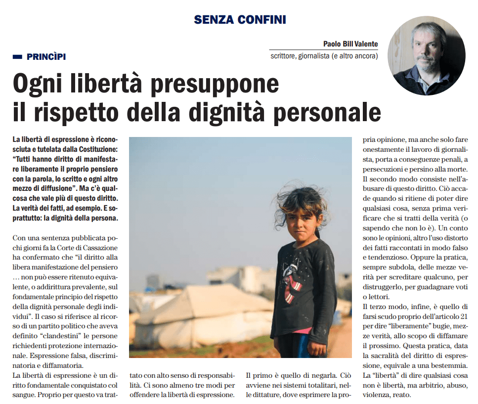 Con una sentenza pubblicata pochi giorni fa la Corte di Cassazione ha confermato che “il diritto alla libera manifestazione del pensiero … non può essere ritenuto equivalente, o addirittura prevalente, sul fondamentale principio del rispetto della dignità personale degli individui”. Il caso si riferisce al ricorso di un partito politico che aveva definito “clandestini” le persone richiedenti protezione internazionale. Espressione falsa, discriminatoria e diffamatoria.
