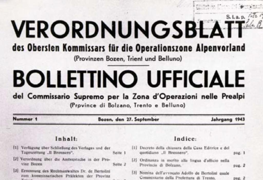 Il 10 settembre è istituita la Zona di operazioni delle Prealpi (Operationszone Alpenvorland) che comprende le province di Bolzano, Trento e Belluno. Essa appartiene formalmente all’Italia, ma è sottoposta all’amministrazione del Terzo Reich.