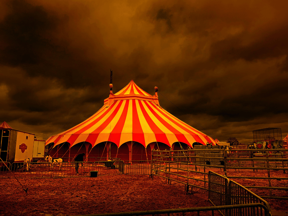 Confuse in quella nebbiolina artificiale le cose del suo mondo sembrano tutte molto più reali. Osserva gli elementi di quel curioso villaggio, che oggi c’è e domani sparisce col suo tanfo e i suoi sgraziati rumori. Mille carri e tendoni, ma nessuna vera casa…