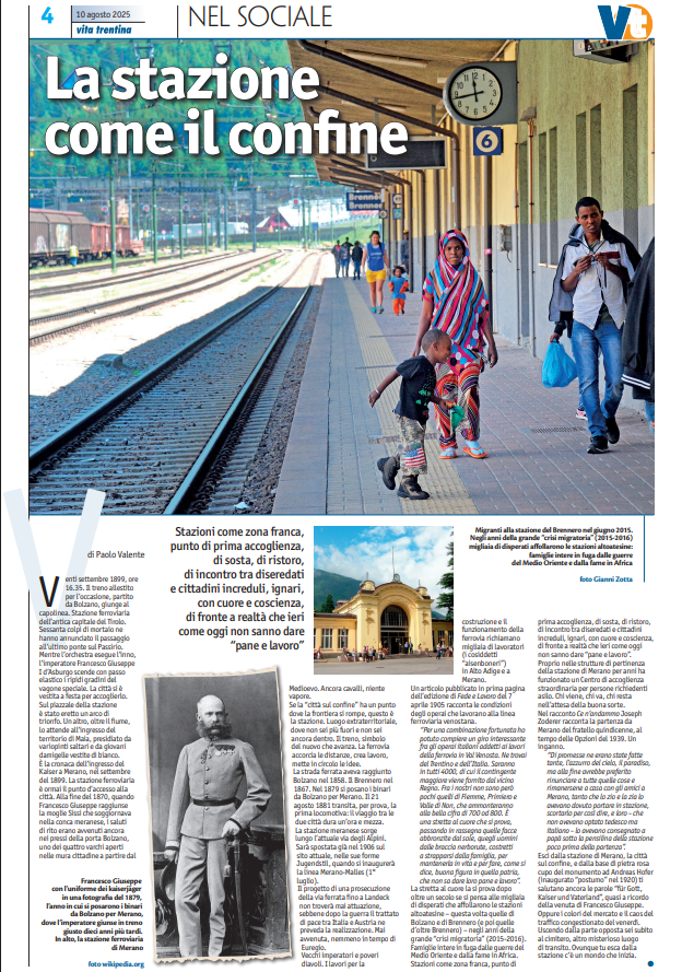 La stretta al cuore la si prova dopo oltre un secolo se si pensa alle migliaia di disperati che affollarono le stazioni altoatesine – questa volta quelle di Bolzano e di Brennero (e poi quelle d’oltre Brennero) – negli anni della grande “crisi migratoria” (2025-2016). Famiglie intere in fuga dalle guerre del Medio Oriente e dalla fame in Africa. Stazioni come zona franca, punto di prima accoglienza, di sosta, di ristoro, di incontro tra diseredati e cittadini increduli, ignari, con cuore e coscienza, di fronte a realtà che ieri come oggi non sanno dare “pane e lavoro”.